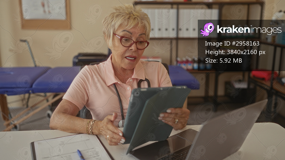 Woman physiotherapist holding tablet and pointing finger to screen at desk with laptop and clipboard in studio; remote care reassurance.