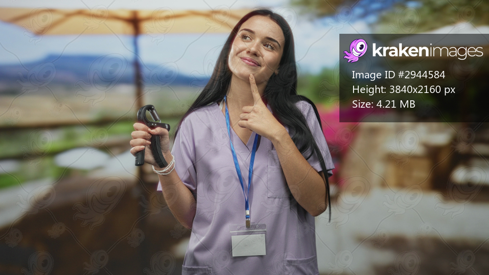 Woman physiotherapist in lilac scrubs holding a handgrip, points finger to chin and wearing badge in studio; thoughtful care.