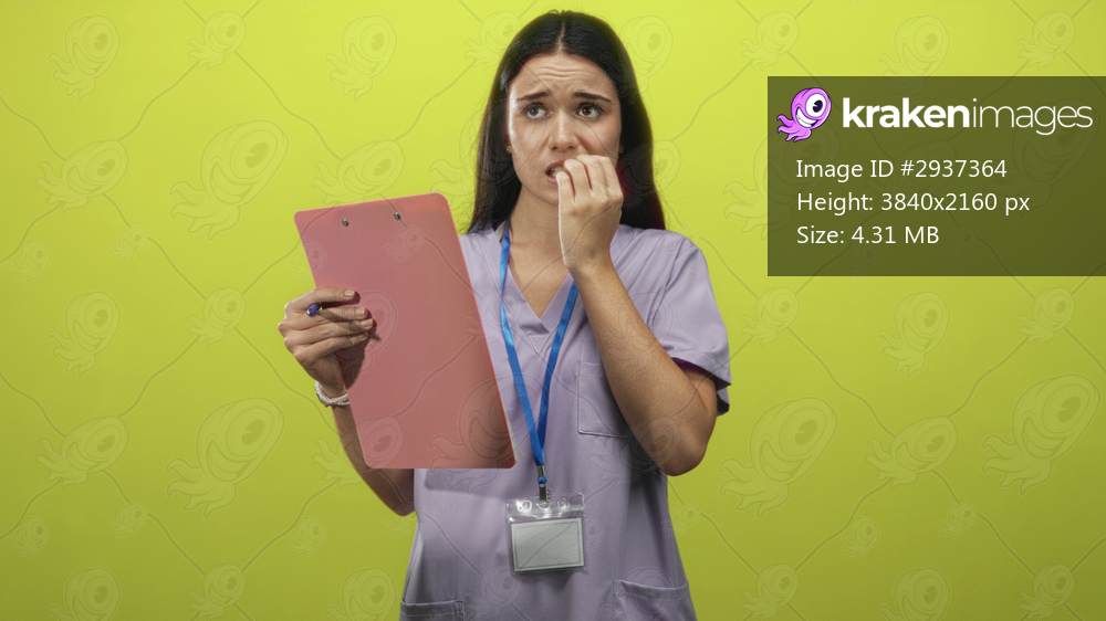 Woman physiotherapist in purple scrubs bites fingernails while holding pink clipboard in studio; anxiety concern.