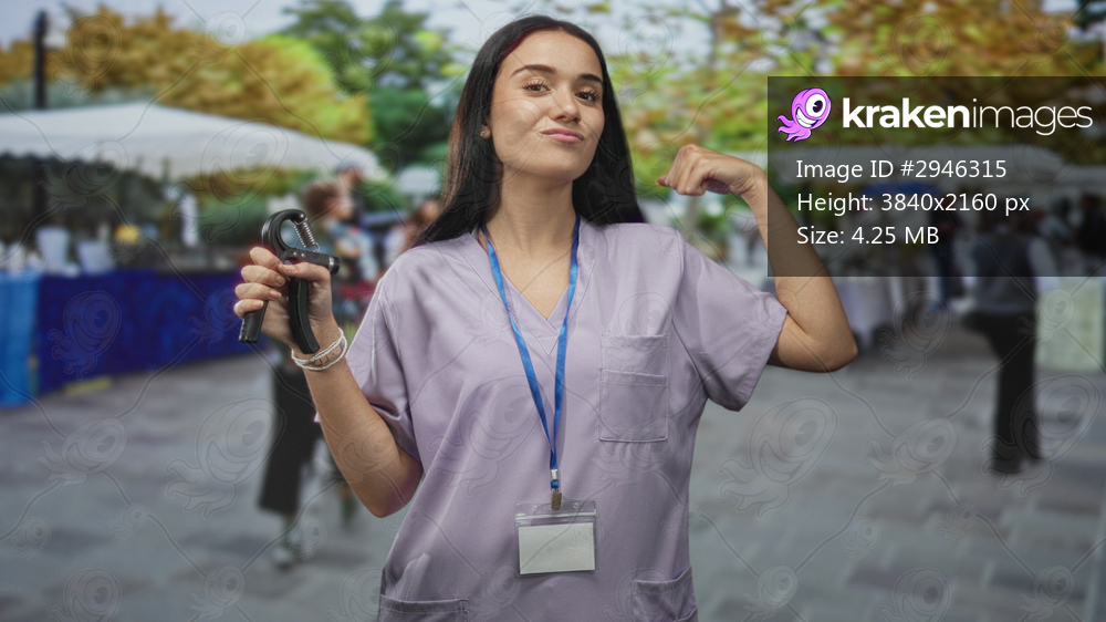 Woman physiotherapist in purple scrubs holding a handgrip, smiling and flexes arm in a street market with vendor tents and crowds; confidence rehabilitation strength. - Kraken Images