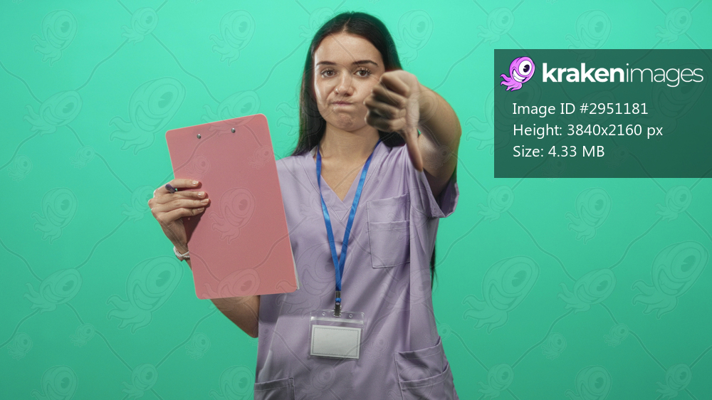 Woman physiotherapist in purple scrubs holding a pink clipboard and alternating thumbs up and thumbs down gestures in studio; reassurance support care. - Kraken Images