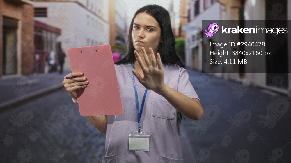 Woman physiotherapist in scrubs holding pink clipboard and pen, palm raised in stop gesture on cobblestone street; concern.