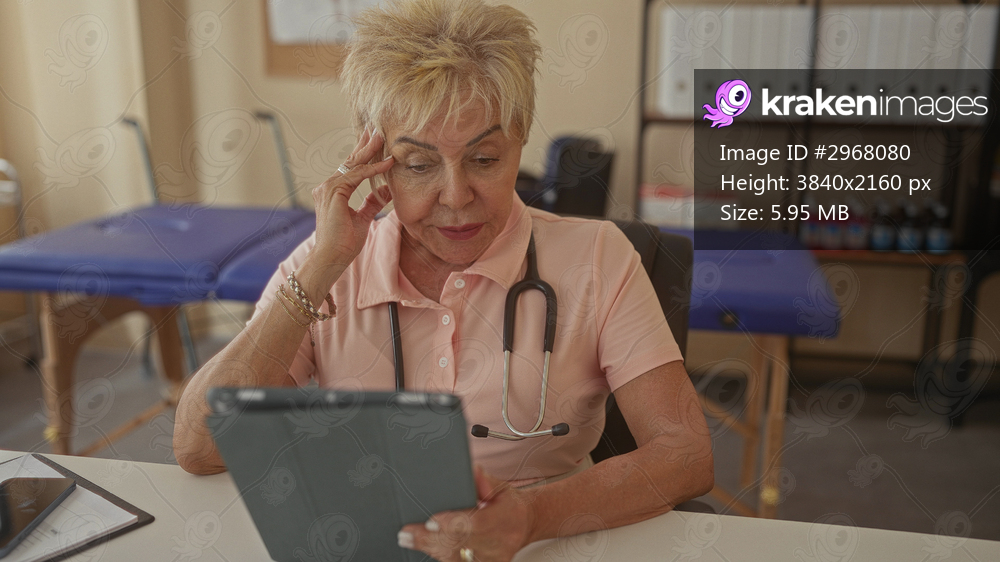 Woman physiotherapist with stethoscope holds tablet, hand to temple and reads screen in clinic building; concern focus empathy.