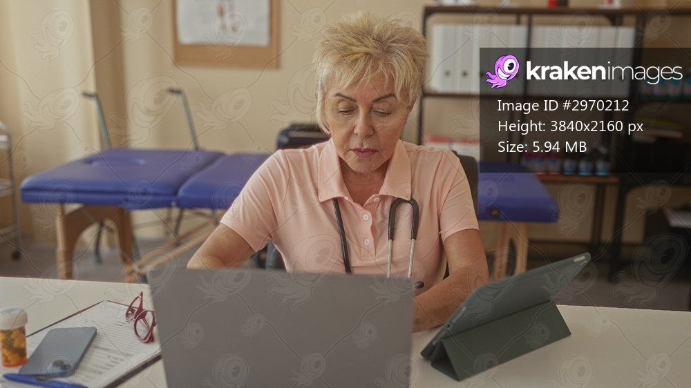 Woman physiotherapist with stethoscope uses tablet and laptop at desk in medical building checking notes and prescription bottle visible; calm focused care. - Kraken Images