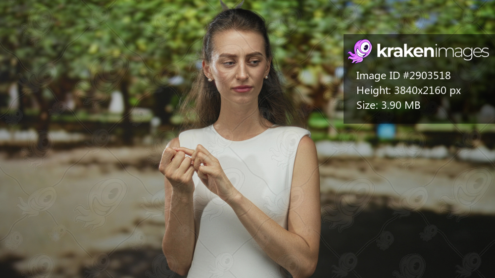 Woman picking at fingernail in forest park setting with bare hands visible and neutral expression; pensive introspection.