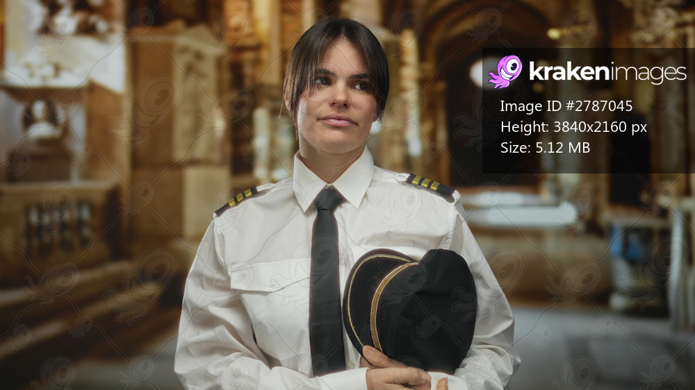 Woman pilot in uniform holding hat in a historic church setting, showcasing a confident expression.