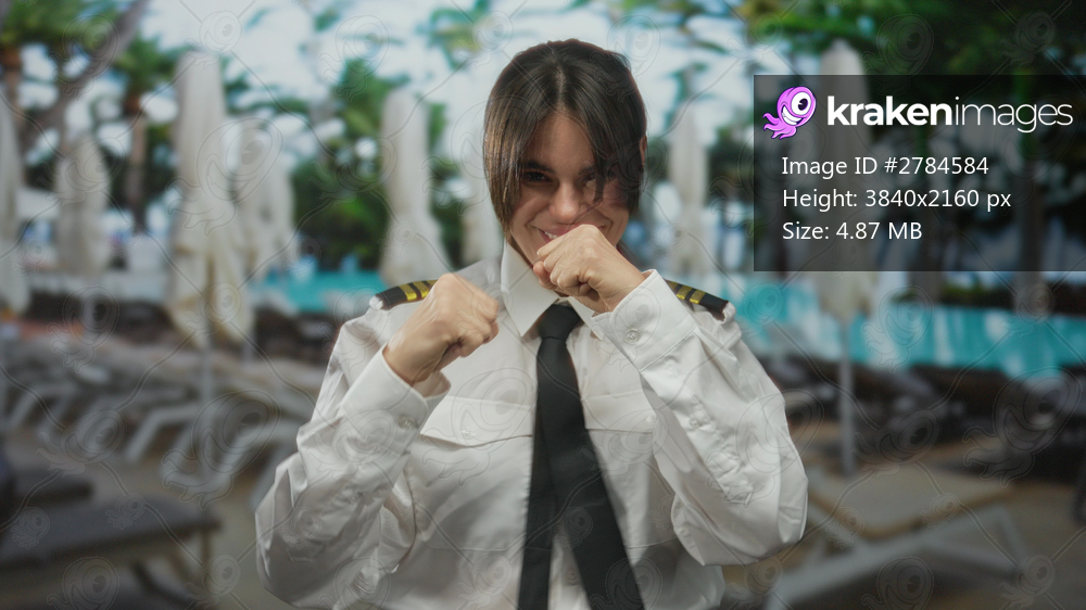 Woman pilot in uniform playfully boxing outdoors at a resort poolside, blending profession with leisure in a lively hotel setting, showcasing determination and fun spirit. - Kraken Images