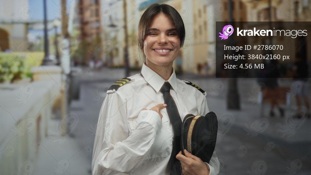 Woman pilot in uniform smiling while pointing to herself on a city street outdoors, confidently holding her hat in a lively urban setting.