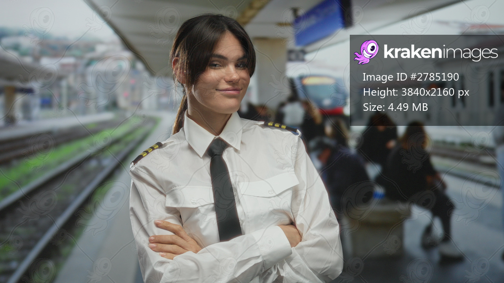 Woman pilot in uniform standing at train station, pointing to head, smiling, showcasing confidence in outdoor railway setting, surrounded by blurred commuters and modern train. - Kraken Images