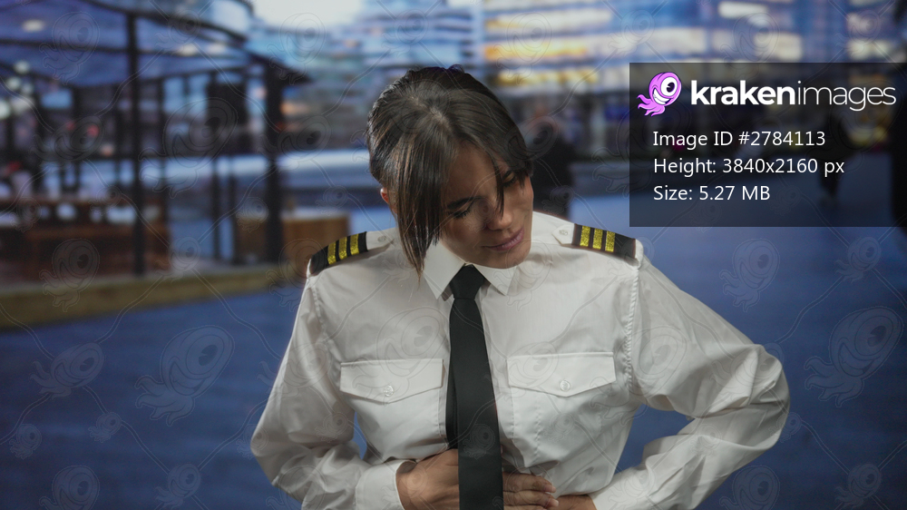 Woman pilot in uniform standing on city street holding her stomach, expressing discomfort, urban backdrop suggesting outdoor scene in a busy metropolitan area. - Kraken Images