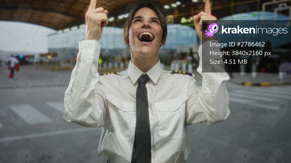 Woman pilot smiling in uniform pointing upwards at airport outdoor showcasing enthusiasm and pride in aviation profession outside terminal building background. - Kraken Images