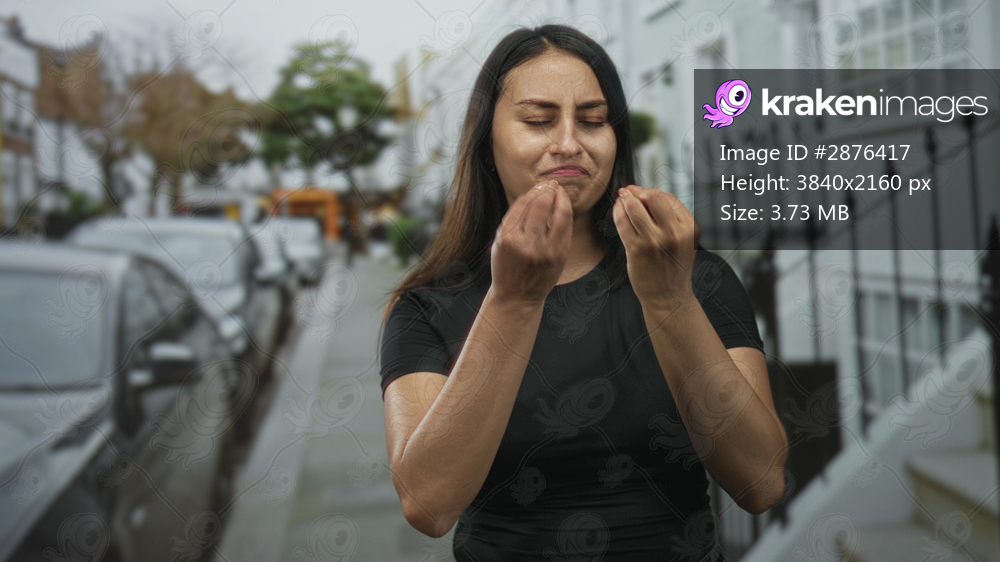 Woman with pinched fingers gesture on a city street, hands raised and wearing a black tee, sidewalk and parked cars visible; frustration.
