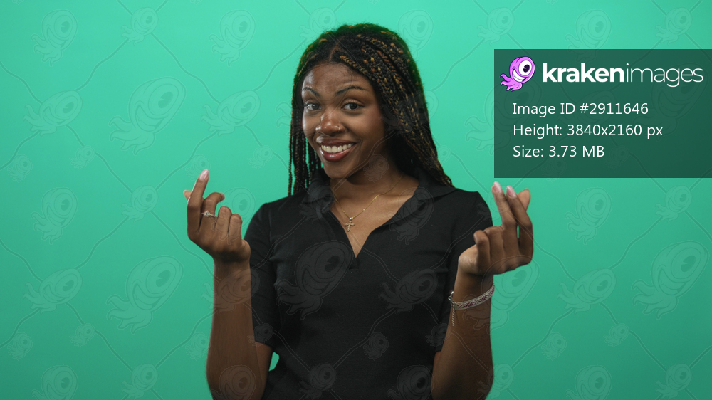 Woman with pinched fingers gesture and sly smile in green studio wearing black polo top and gold cross necklace; playful confidence.