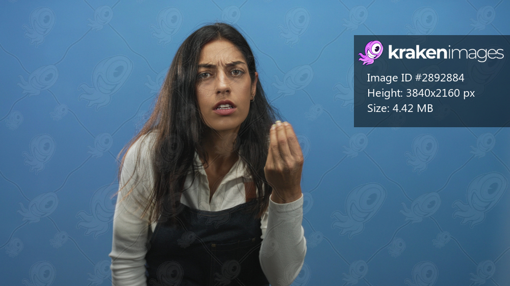 Woman with pinched fingers gesture and tense face in blue studio leaning forward wearing dark apron; frustration insistence urgency.