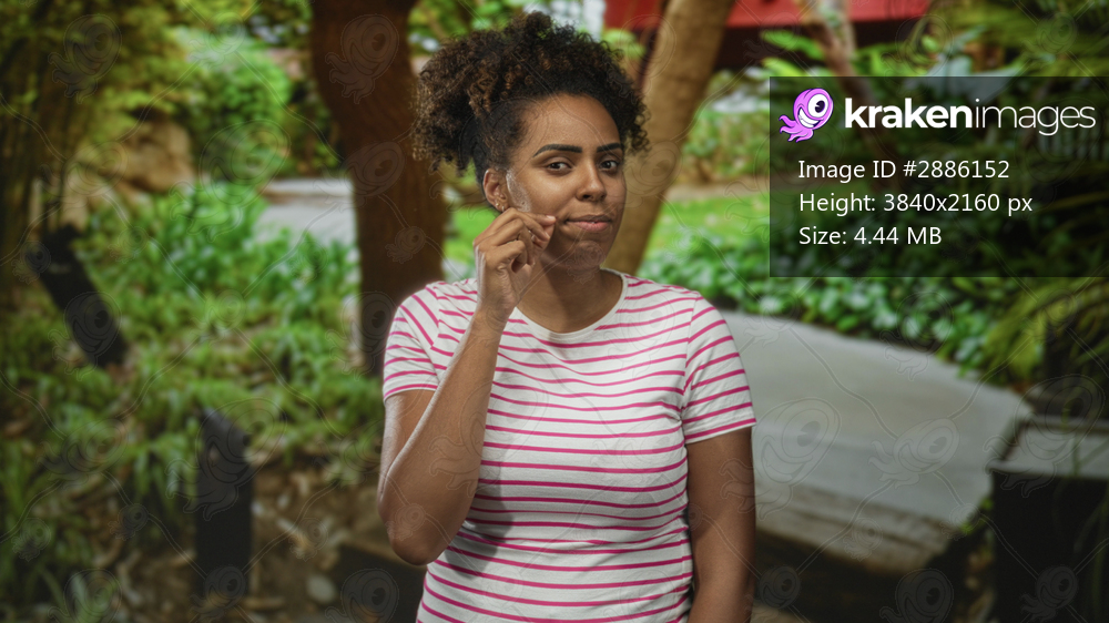 Woman pinched nose with fingers in forest path of a green park, holding face near nostrils; disgust odor reaction.