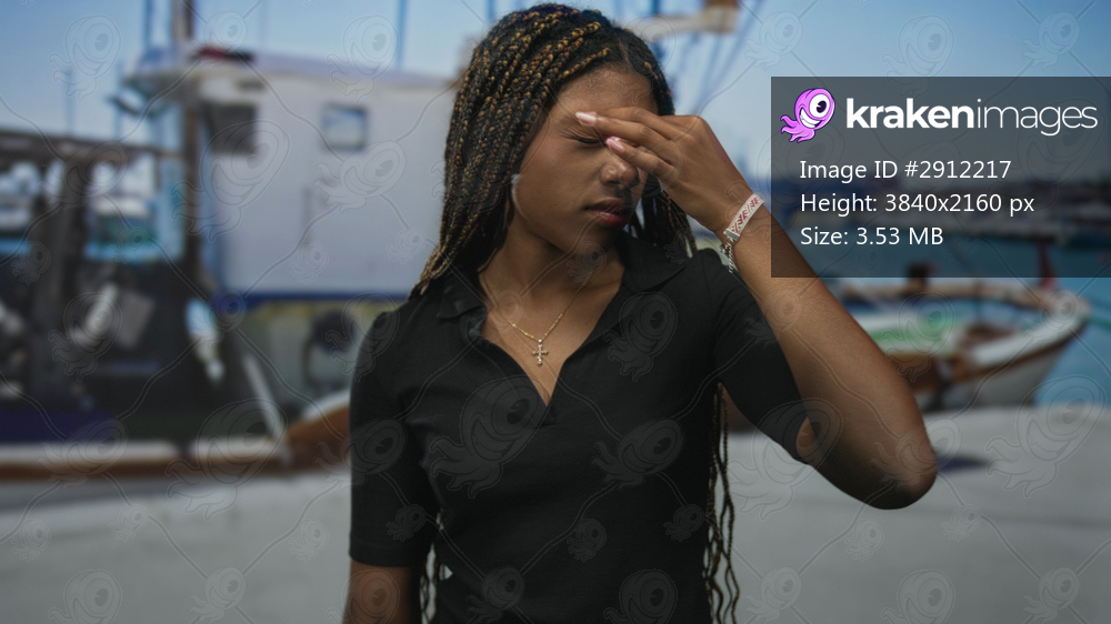 Woman pinched nose holding bridge of nose with fingers beside moored boat at port pier, wearing cross necklace; odor discomfort.