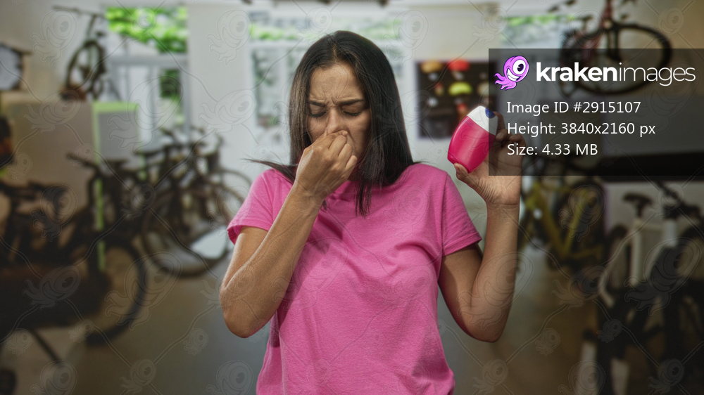 Woman pinched nose holding deodorant bottle wearing pink t shirt in bike shop aisle; disgust annoyance.