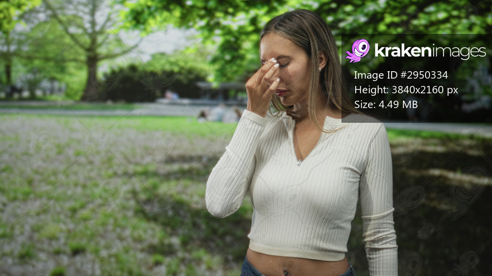 Woman pinched nose in park under green trees, hand on bridge of nose and ribbed white sweater visible; allergy discomfort.