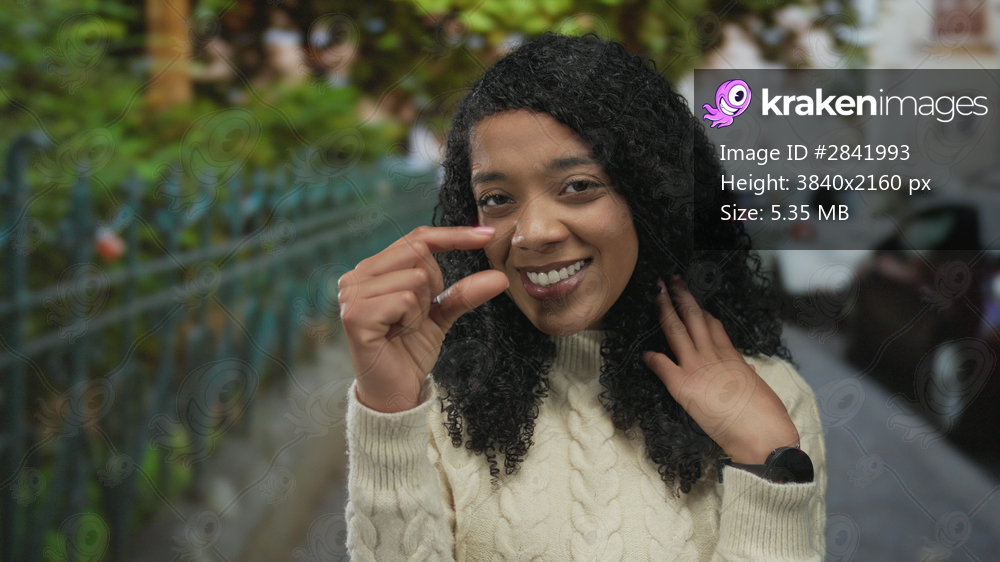 Woman pinches finger to show small size on busy street amid parked cars in daylight; precision determination.