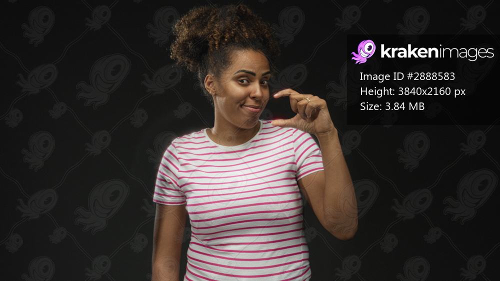 Woman pinches fingers close in black studio while wearing a white and pink striped tee and showing a wry expression; skepticism.