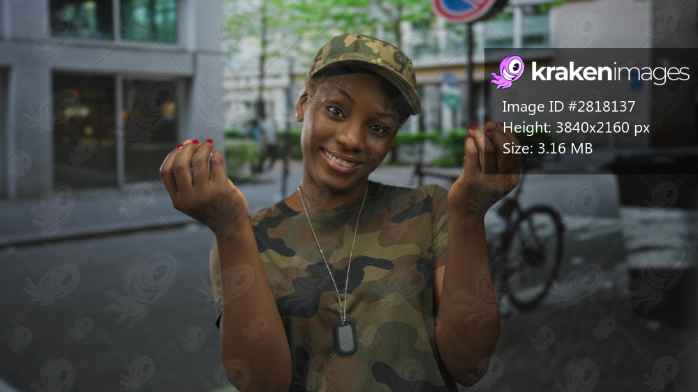Woman pinches fingers for money gesture on urban street with camouflage cap and dog tags in daylight near parked bicycle; wealth ambition.