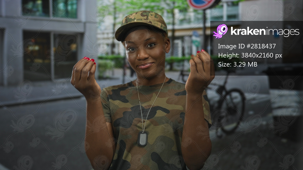 Woman pinches fingers for money gesture on urban street with camouflage cap and dog tags in daylight near parked bicycle; wealth ambition.