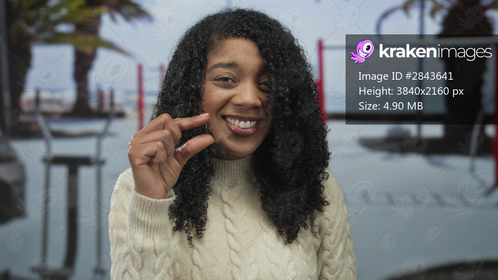 Woman pinches fingers for small size indication in studio wearing cream sweater; attention precision happiness.
