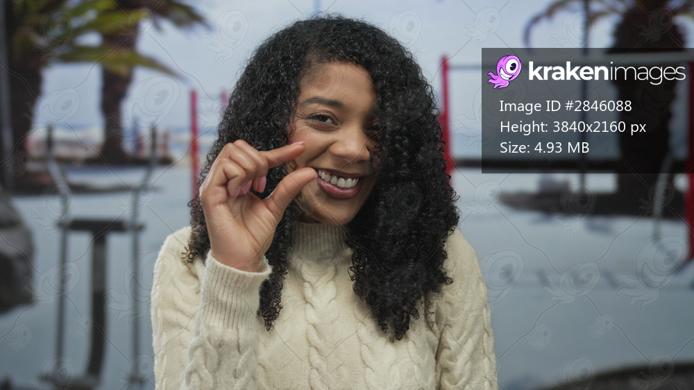 Woman pinches fingers for small size indication in studio wearing cream sweater; attention precision happiness.