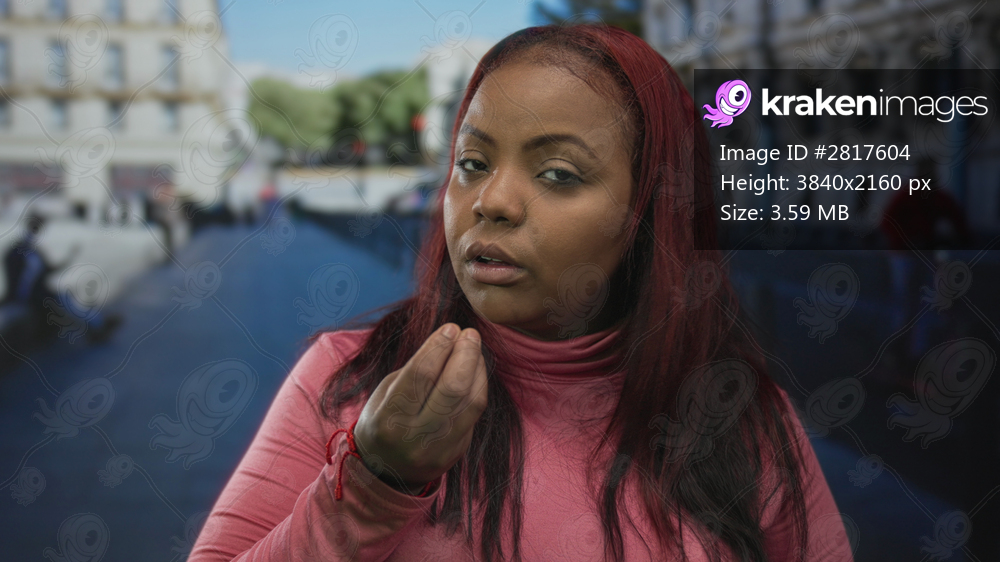 Woman pinches fingers with hand on city street in front of building wearing turtleneck top; frustration.