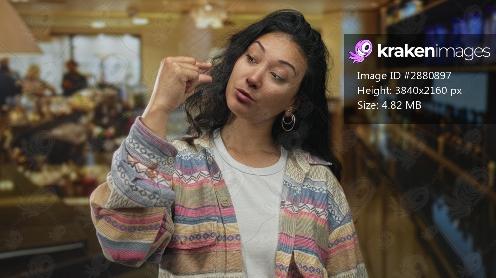 Woman pinches fingers near face in restaurant building, smiling and wearing patterned jacket and hoop earrings; playful teasing.