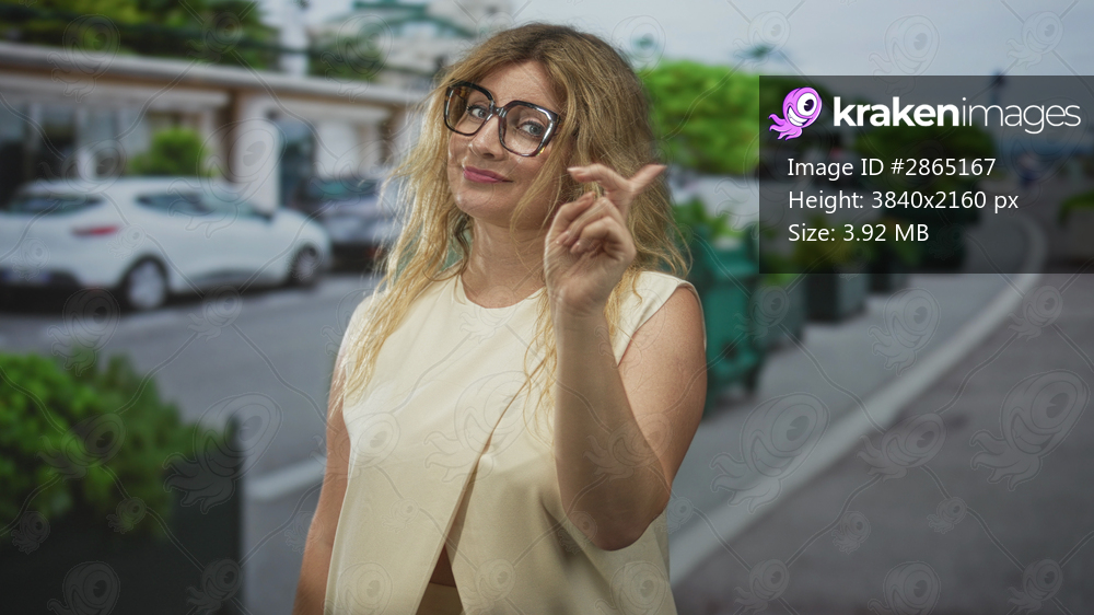 Woman pinches fingers with raised hand on a city street near parked cars and planters; playful confidence.
