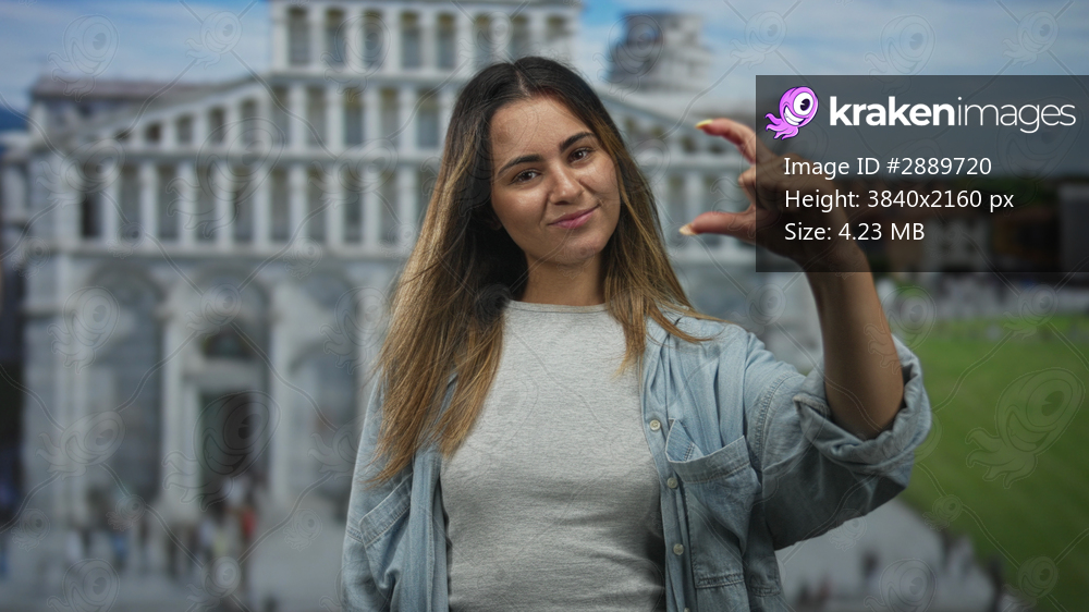Woman pinches fingers to mimic pisa tower while standing in front of building with casual shirt and neutral expression; playful travel memory.