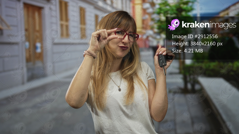 Woman pinches fingers to show small size while holding car keys on a city street; playful confidence.