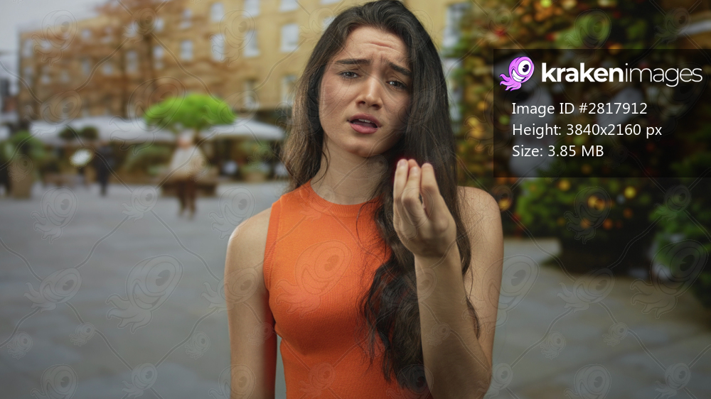 Woman pinches fingertips of her hand on outdoor city street with blurred pedestrians under natural light; frustration.