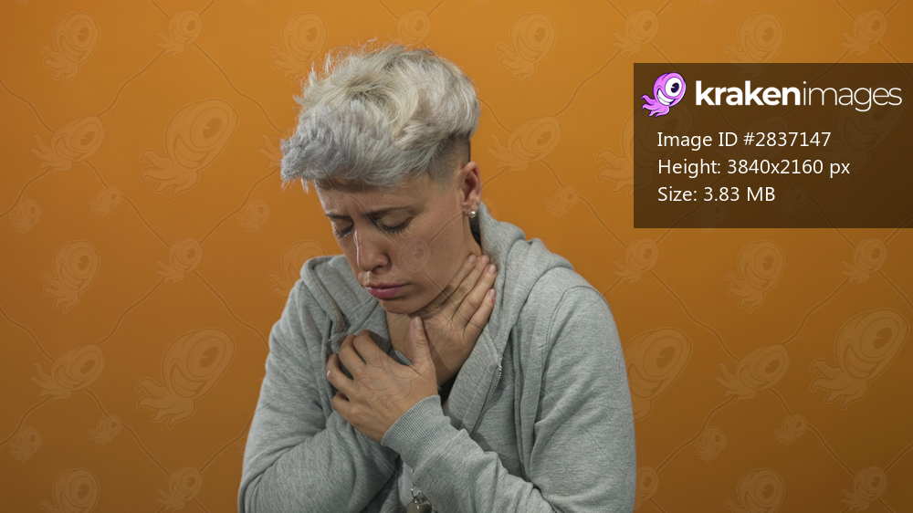 Woman pinches her nose against strong odor in orange studio environment while eyes close tightly; disgust discomfort.