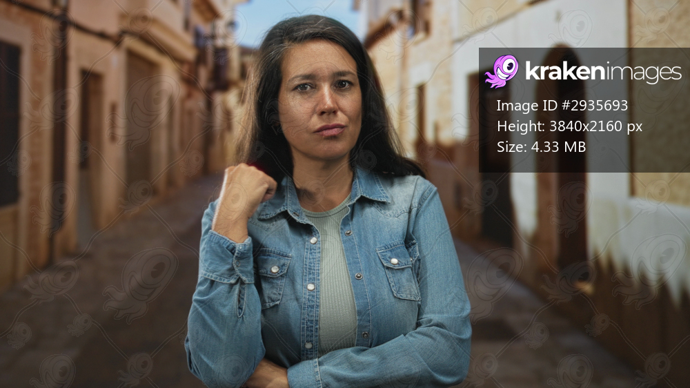 Woman pinches nose and covers mouth with hand on a narrow cobblestone street while later pointing to her chest and throat; disgust.