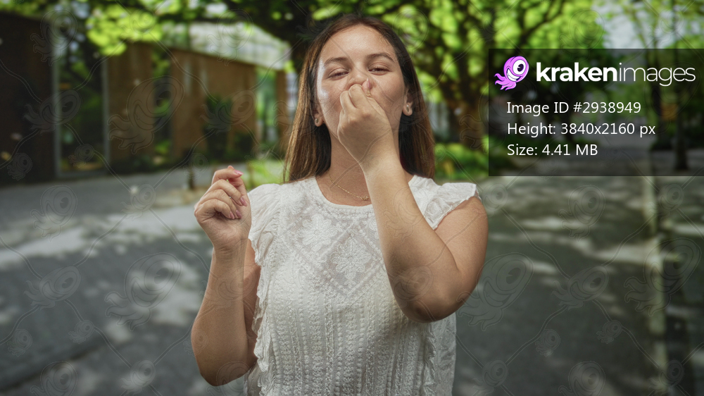 Woman pinches nose with fingers on a tree lined street beside a building entrance in daylight; disgust reaction.