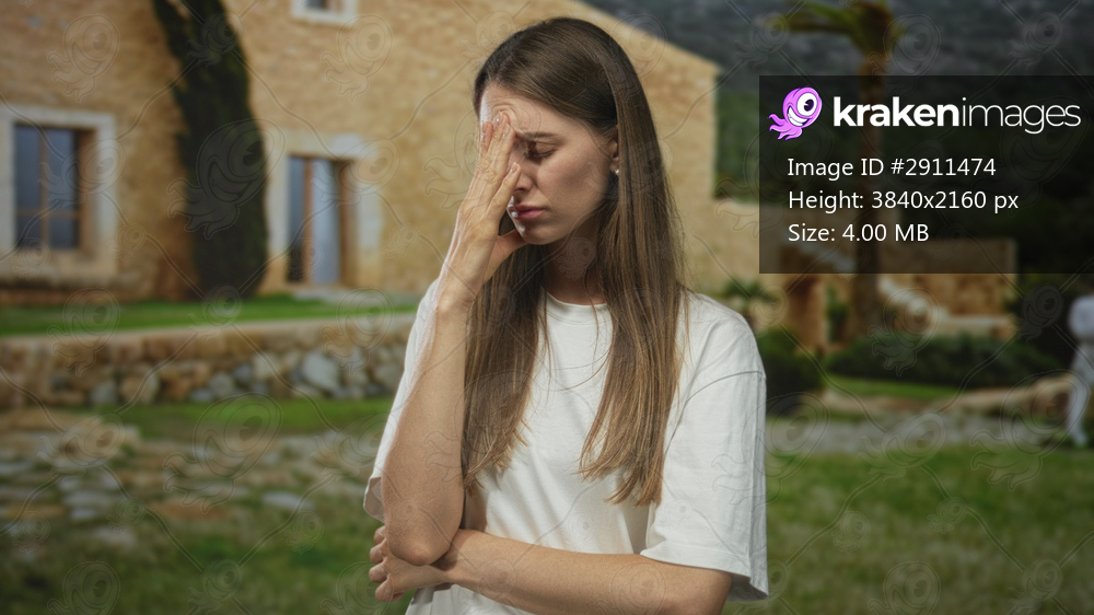 Woman pinches nose with fingers while holding arm across chest at stone house building entrance outdoors near palm tree and stone wall; disgust odor.