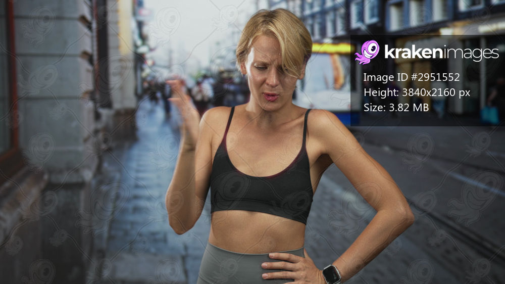 Woman pinches nose with fist near face, sports bra and bare midriff on street with tram visible; disgust.