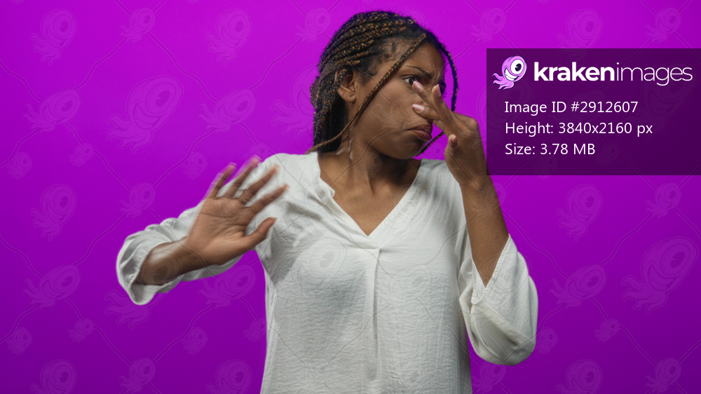 Woman pinches nose and grimaces in studio under magenta backdrop wearing white blouse and braids; disgust smell aversion.