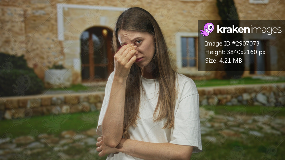 Woman pinches nose with hand at house entrance of a stone building, holding her other arm across chest; discomfort nausea smell.