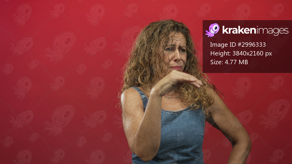 Woman pinches nose with hand in studio red backdrop wearing a denim sleeveless top and grimacing; disgust aversion smell.