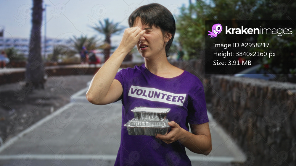 Woman pinches nose with hand while holding stacked foil food containers wearing volunteer shirt on a sunny street lined with palm trees and stone wall; frustration. - Kraken Images