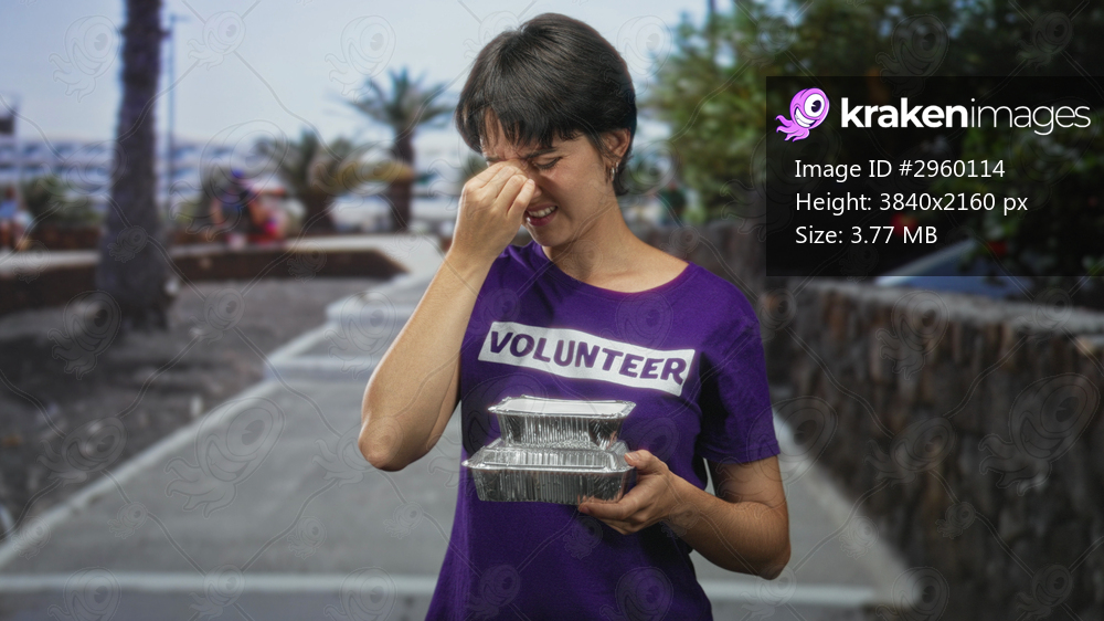 Woman pinches nose with hand while holding stacked foil food containers wearing volunteer shirt on a sunny street lined with palm trees and stone wall; frustration. - Kraken Images