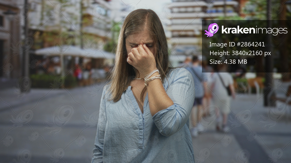 Woman pinches nose with her right hand in a crowded pedestrian street lined with outdoor cafes; odor smell stink disgust.
