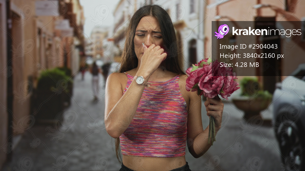 Woman pinches nose holding pink bouquet on narrow european street with parked car and planters; disgust smell reaction.