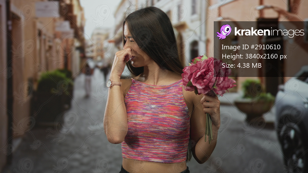 Woman pinches nose holding pink bouquet on narrow european street with parked car and planters; disgust smell reaction.