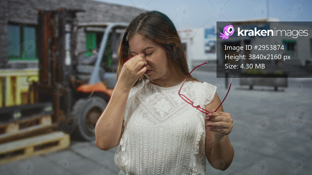 Woman pinches nose holding red glasses on a city street near a forklift and wooden pallets outside a warehouse building; disgust.