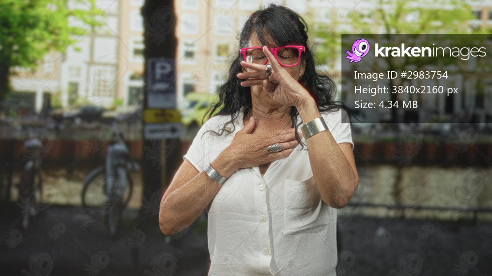 Woman pinches nose and holds chest while wearing pink glasses on a canal street; odor reaction disgust.