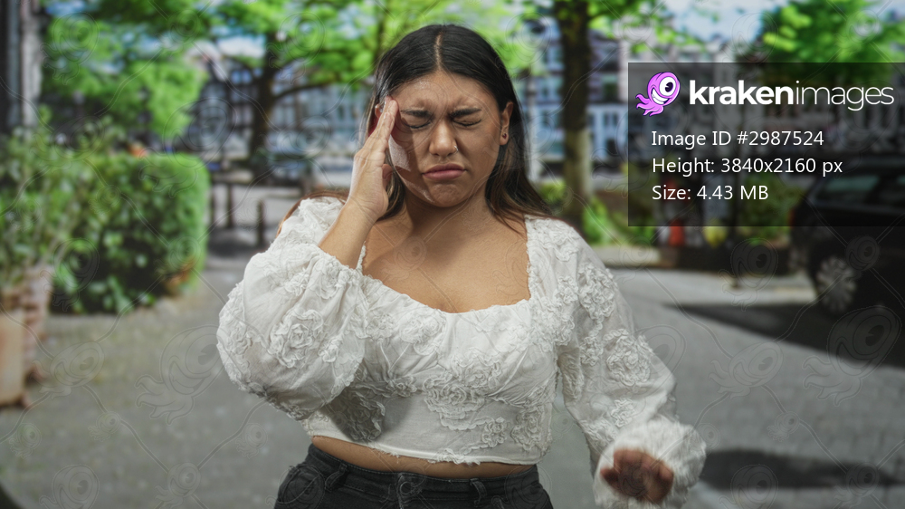 Woman pinches nose on street wearing white embroidered cropped top with hand on hip and eyes closed, near parked car and hedge; discomfort concern.
